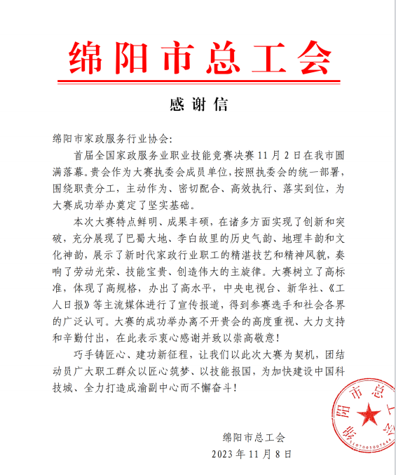 綿陽市家政服務行業協會力助首屆全國家政服務業技能競賽決賽在綿陽圓滿落幕,綿陽市總工會高度贊揚,綿陽市美新家政熱烈祝賀!
